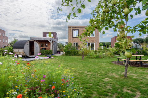 Middels de brede schuifpui vanuit de woonkamer betreedt u de ruime achtertuin gelegen op het noordwesten, waarbij u lang kunt genieten van het zonnetje.